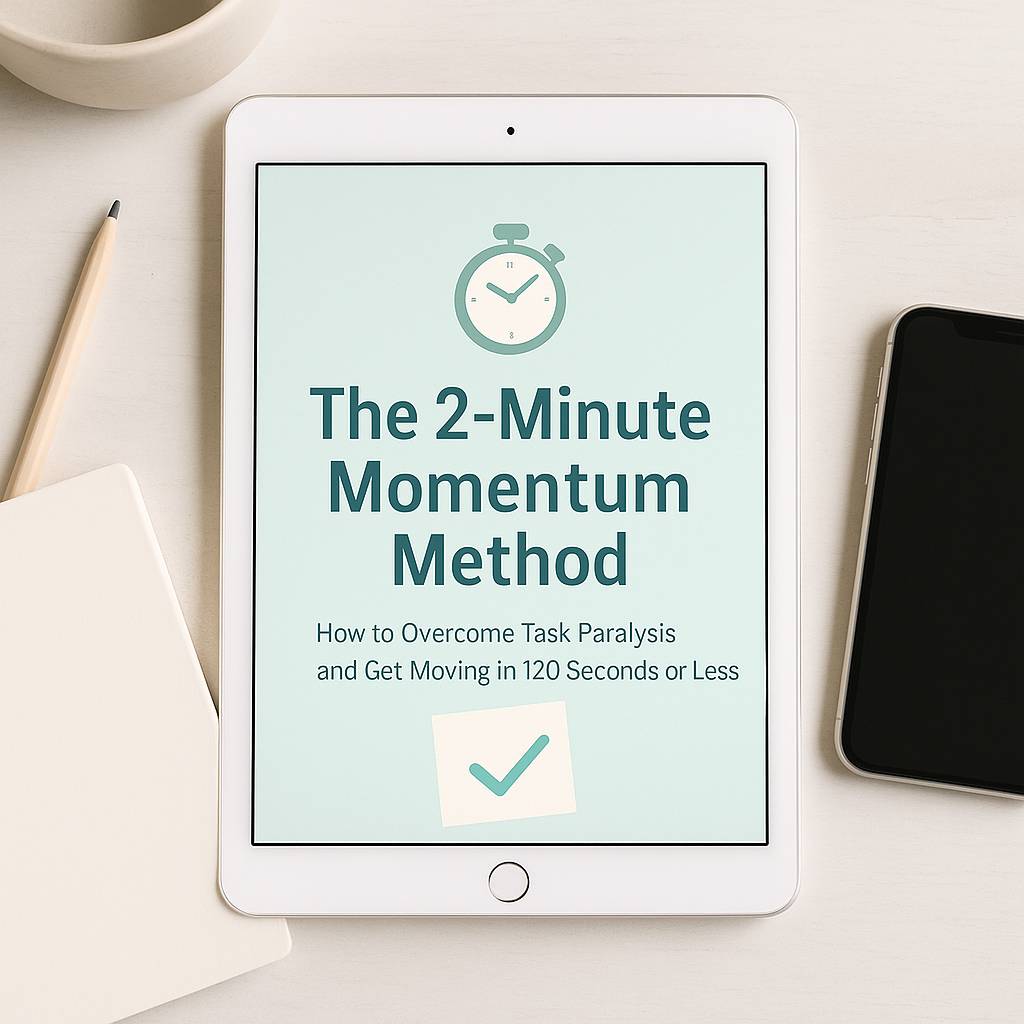 The 2-Minute Momentum Method is your step-by-step antidote to ADHD task paralysis. It’s a short, powerful PDF guide that helps you break through overwhelm using a proven 3-step ritual you can do in under 2 minutes.